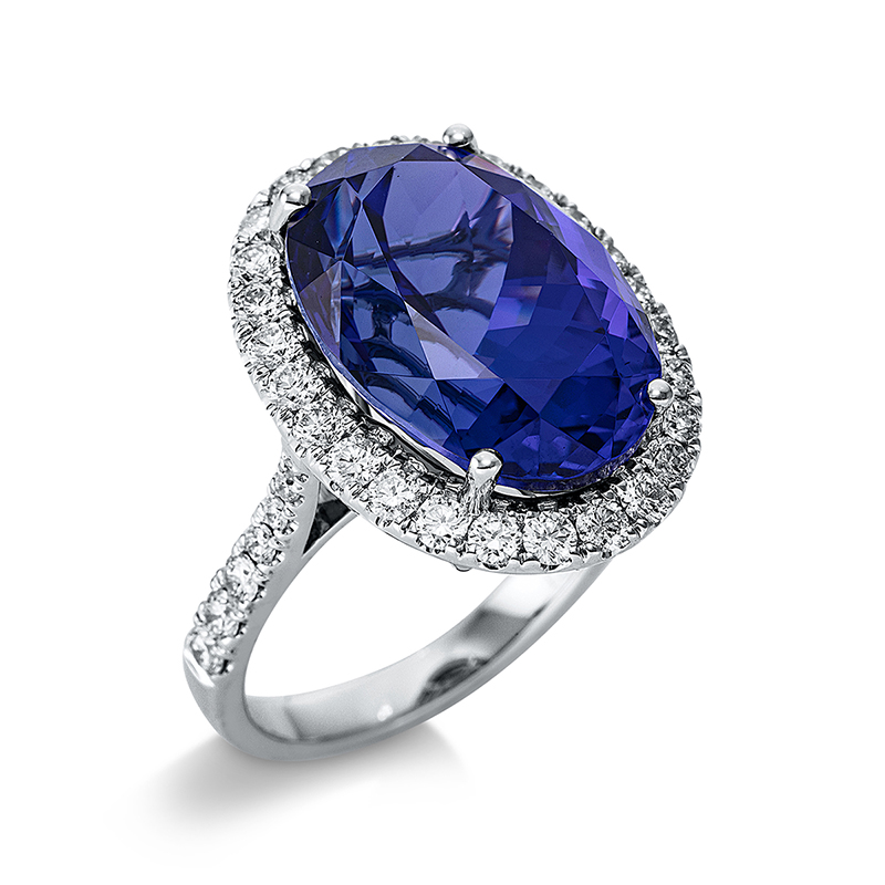 Ring 4er-Krappe 18 kt WG, 40 Brillanten 1,06 ct, TW-si, 1 Tansanit 13,88 ct blau, H:16,0 mm, B:20,8 mm, Weite:54