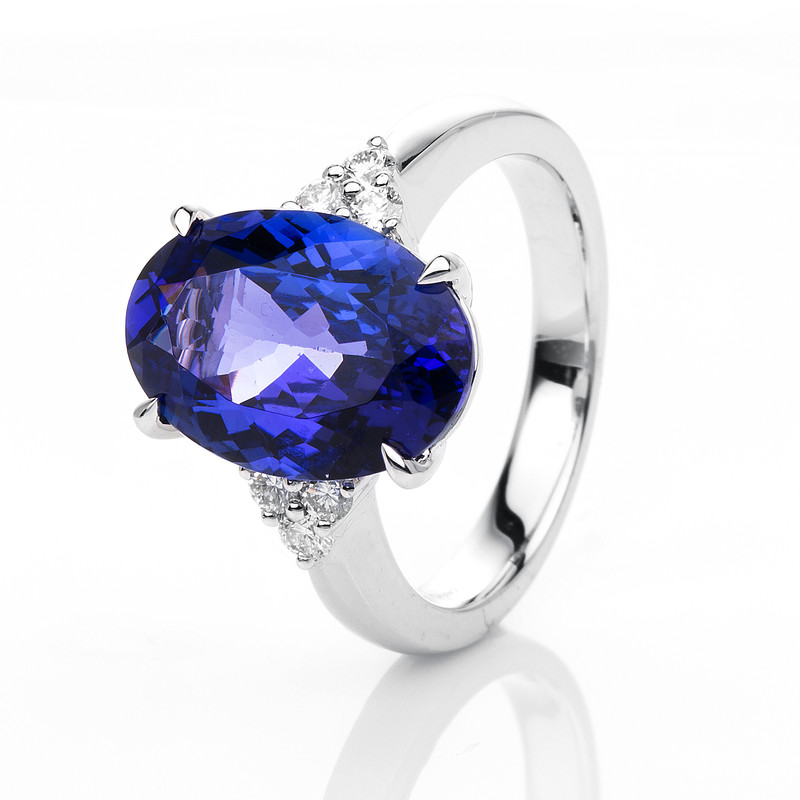 Ring 4er-Krappe 18 kt WG, 6 Brillanten 0,24 ct, TW-si, 1 Tansanit 8,23 ct blau, Weite:54