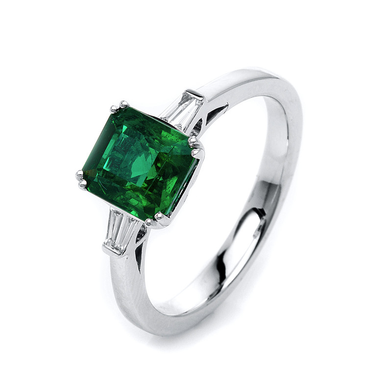Ring 4er-Krappe 18 kt WG, 4 Baguette 0,10 ct, TW-si, 1 Smaragd 1,69 ct grün, Weite:54