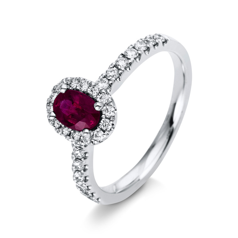 Ring 4er-Krappe 18 kt WG, 28 Brillanten 0,33 ct, TW-si, 1 Rubin 0,48 ct rot, Weite:53