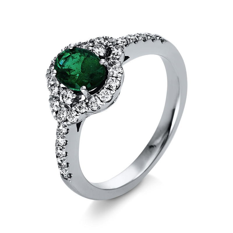 Ring 4er-Krappe 18 kt WG, 30 Brillanten 0,43 ct, TW-vsi, 1 Smaragd 0,82 ct grün, Weite:54