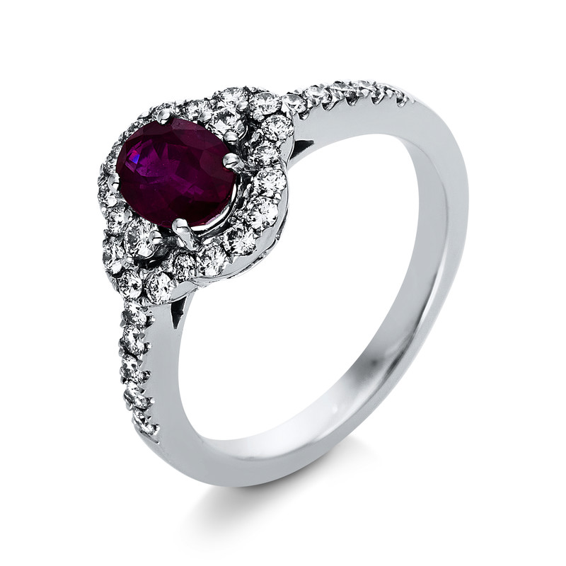 Ring 4er-Krappe 18 kt WG, 30 Brillanten 0,44 ct, TW-vsi, 1 Rubin 1,02 ct rot, Weite:54