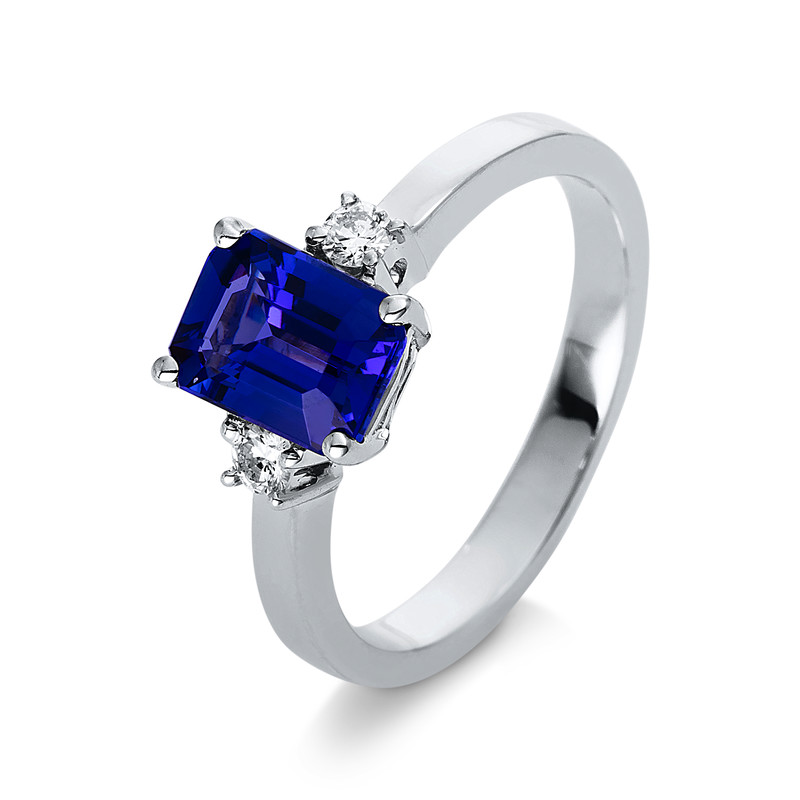 Ring 4er-Krappe 18 kt WG, 2 Brillanten 0,12 ct, TW-si, 1 Tansanit 1,54 ct blau, H:6,1 mm, B:8,2 mm, Weite:54