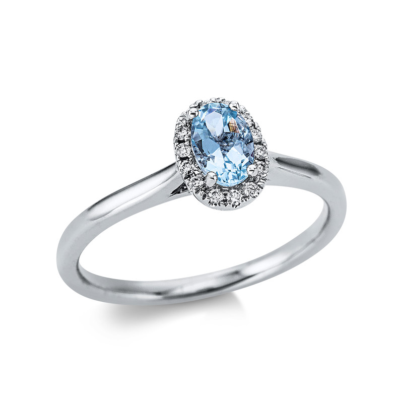 Ring 4er-Krappe 18 kt WG, 14 Brillanten 0,07 ct, TW-si, 1 Aquamarin 0,44 ct blau, Weite:53