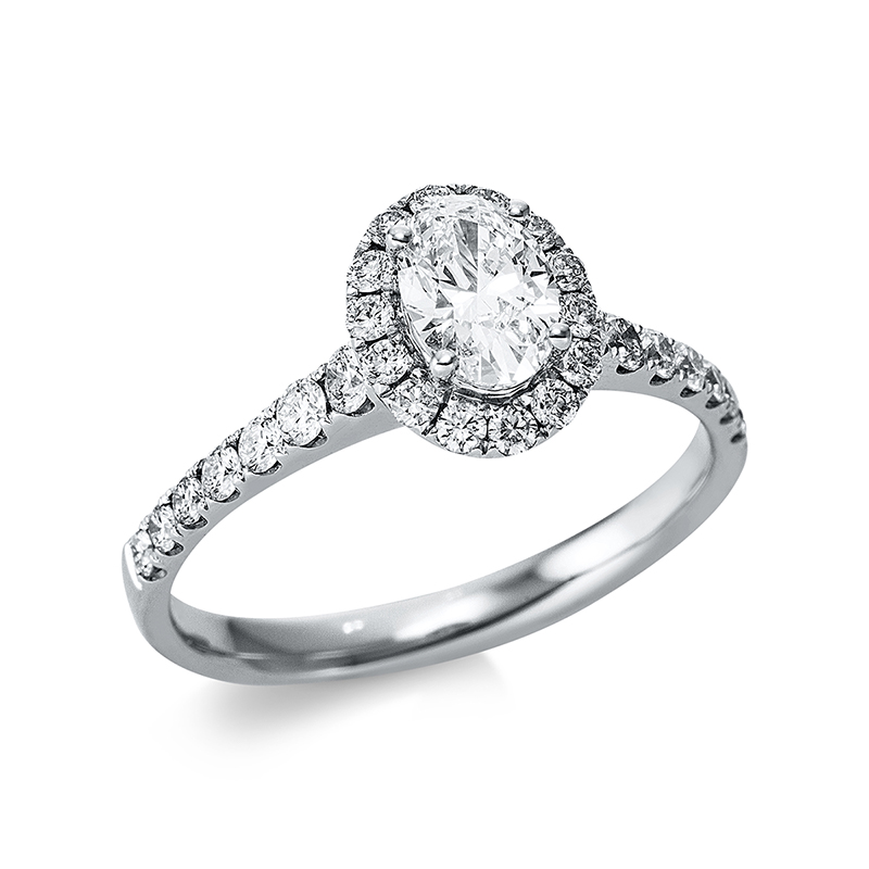 Ring 4er-Krappe 18 kt WG, GIA 1323110333, 1 Oval 0,52 ct, D-if, 32 Brillanten 0,49 ct, TW-si, Weite:54