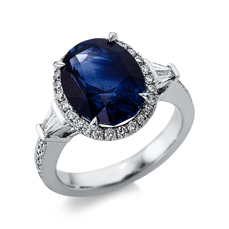 Ring 4er-Krappe 18 kt WG, GRS2019086662, 4 Brillanten 0,18 ct, TW-si, 37 Brillanten 0,51 ct, TW-si, 1 Saphir 7,82 ct blau, Weite:54