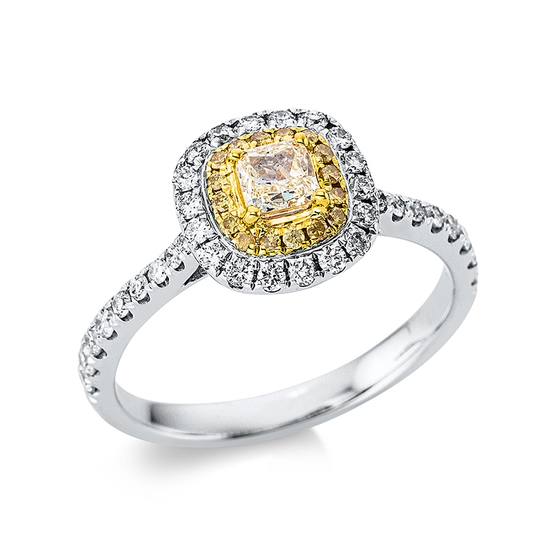 Ring 4er-Krappe 18 kt WG+GG, 36 Brillanten 0,48 ct, TW-si, 1 Cushion 0,36 ct, gelb, 16 Brillanten 0,09 ct, gelb, Weite:54