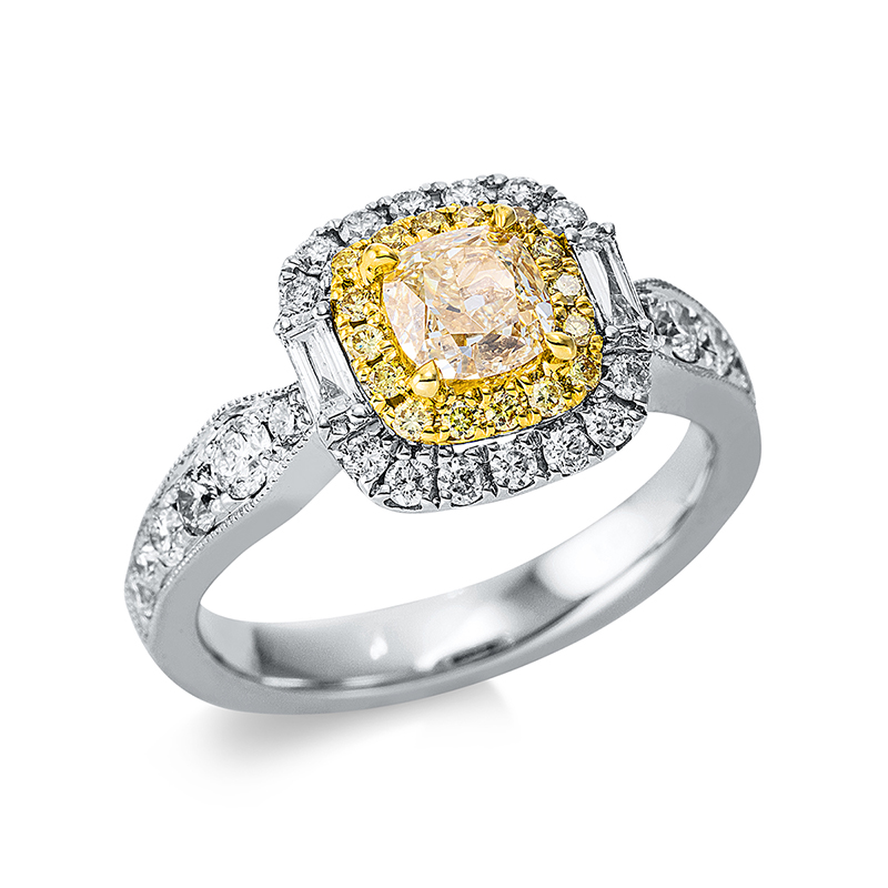 Ring 4er-Krappe 18 kt WG+GG, 2 Baguette 0,08 ct, TW-si, 26 Brillanten 0,60 ct, TW-si, 1 Cushion 1,01 ct, gelb, 16 Brillanten 0,12 ct, gelb, H:11,2 mm, B:10,9 mm, Weite:54