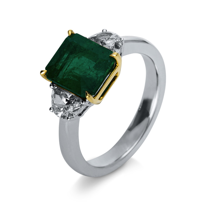 Ring 4er-Krappe 18 kt WG+GG, 2 Halbmond 0,73 ct, TW-si, 1 Smaragd 3,00 ct grün, Weite:54