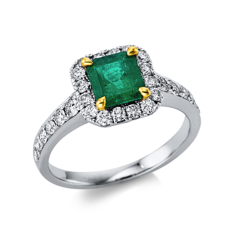 Ring 4er-Krappe 18 kt WG+GG, 28 Brillanten 0,68 ct, TW-si, 1 Smaragd 1,28 ct grün, Weite:54