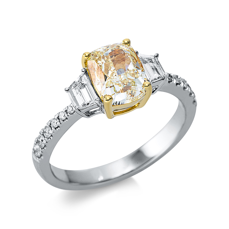 Ring 4er-Krappe 18 kt WG+GG, GIA 2437822890, 2 Trapeze 0,28 ct, TW-si, 1 Cushion 2,00 ct, gelb-vs2, 12 Brillanten 0,15 ct, TW-si, Weite:54