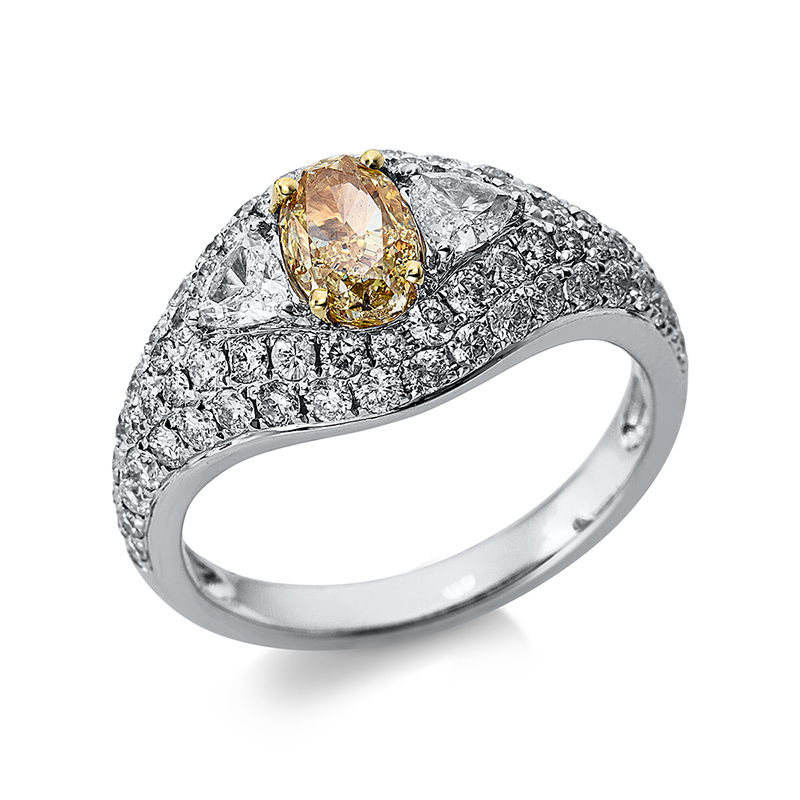 Ring 4er-Krappe 18 kt WG+GG, GIA 6391705674, 2 0,30 ct, TW-si, 1 Oval 1,00 ct, gelb-pi, 68 Brillanten 1,06 ct, TW-si, Weite:54
