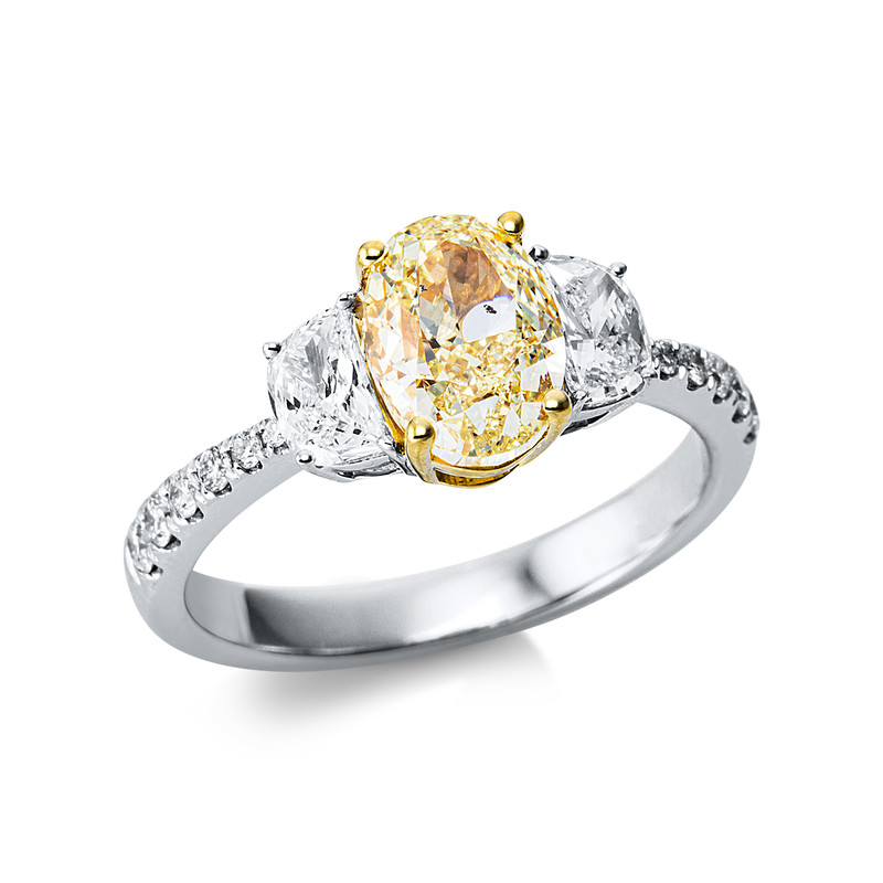 Ring 4er-Krappe 18 kt WG+GG, GIA6194872510, 2 Halbmond 0,53 ct, TW-si, 1 Oval 2,00 ct, gelb-si, 12 Brillanten 0,20 ct, TW-si, Weite:54