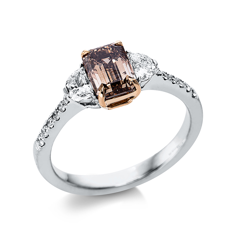 Ring 4er-Krappe 18 kt WG+RG, 12 Brillanten 0,12 ct, D-vsi/si, 2 Halbmond 0,34 ct, F-vsi, 1 Sm.schliff 1,35 ct, braun-vsi, Weite:53