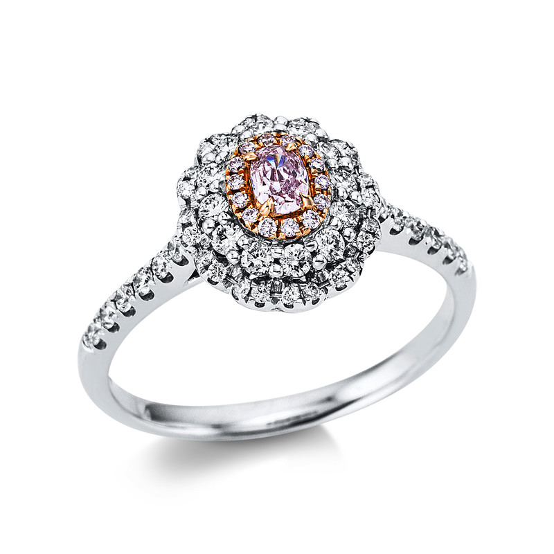 Ring 4er-Krappe 18 kt WG+RG, AGL Cert., 48 Fant-Schl. 0,40 ct, TW-si, 1 Oval 0,12 ct, pink, 14 Brillanten 0,04 ct, pink, Weite:51