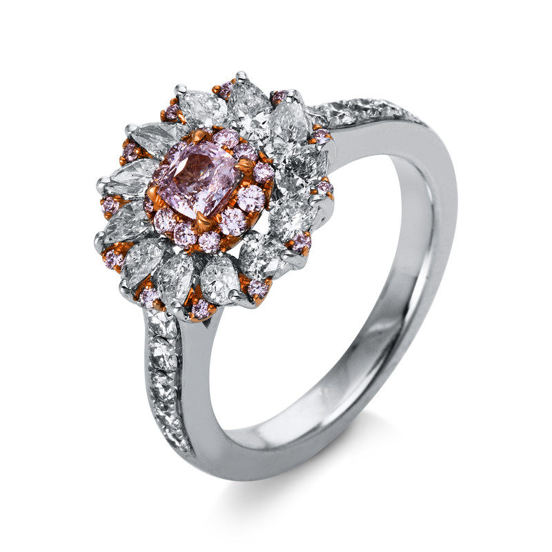 Ring 4er-Krappe 18 kt WG+RG, GIA2185189139, 12 Tropfen 0,92 ct, TW-si, 1 Cushion 0,32 ct, pink-si, 10 Brillanten 0,37 ct, TW-si, 24 Brillanten 0,21 ct, pink, Weite:54